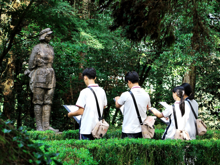 学生在革命烈士伍若兰雕塑前画像。新华社记者 陈浚武 摄