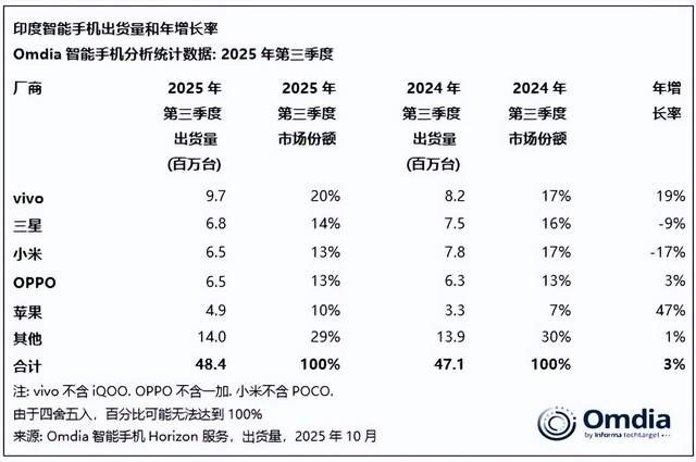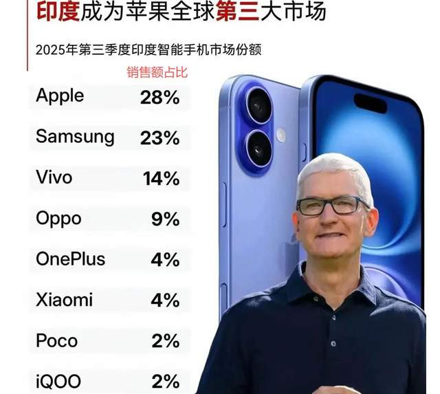 近日,有机构公布了2025年三季度,按照销售额来排名的手机份额情况,我们看到苹果,以28%的销售额,占到了印度市场的第一名。