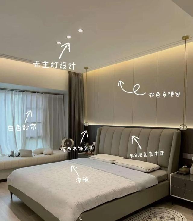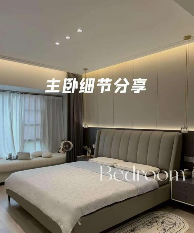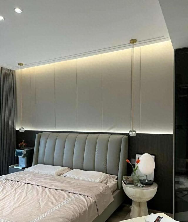 卧室半墙木饰面藏着灯带,暖光一开,再丧的打工人也能秒变葛优躺。