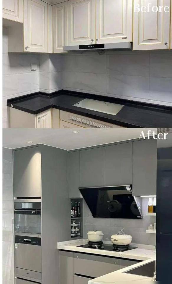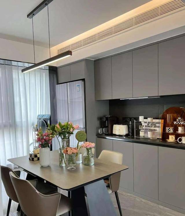 厨房L型布局+隐藏式冰箱,台面空到能跳广场舞。