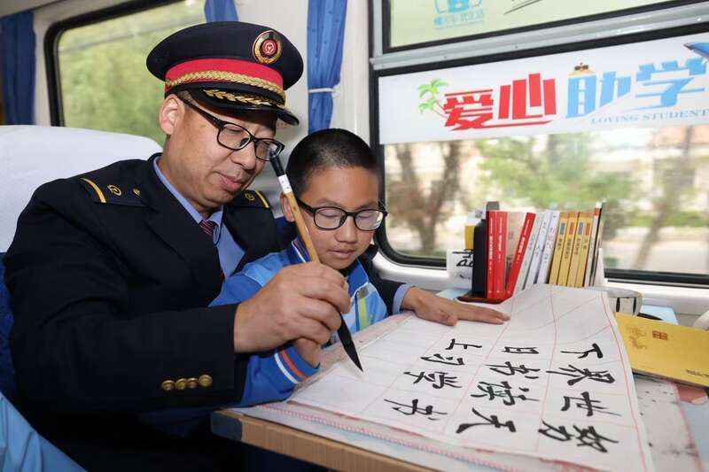 “今天在慢火车上不仅读了好书,还跟叔叔学写了毛笔字!”来自陕西省凤县双石铺中学的学生文李弋扬开心地说。此时,列车工作人员罗宝成正手握毛笔带孩子们临摹习字,在横竖撇捺间感受汉字的独特魅力。