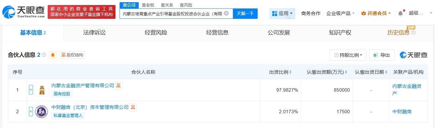 【大河财立方消息】天眼查App显示股票配资代码,近日,内蒙古培育重点产业引导基金股权投资合伙企业(有限合伙)成立,执行事务合伙人为中财融商(北京)资本管理有限公司,出资额86.75亿人民币,经营范围包括以私募基金从事股权投资、投资管理、资产管理等活动。合伙人信息显示,该基金由内蒙古金融资产管理有限公司、中财融商(北京)资本管理有限公司共同出资。